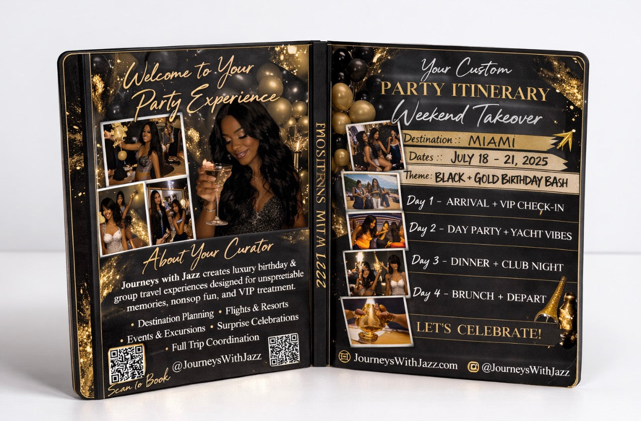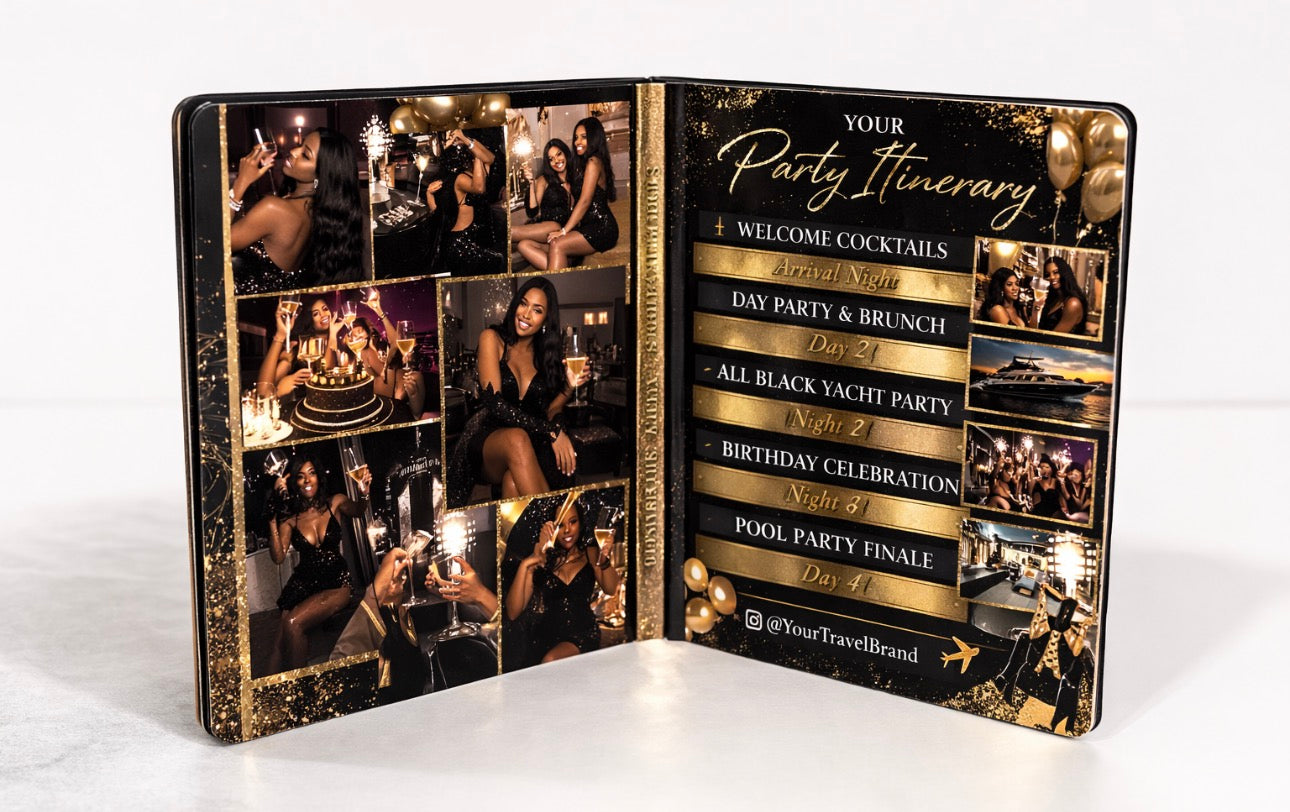 Create a custom passport-style booklet for your birthday trip, girls getaway, or destination celebration. Designed to look like a real travel passport, each booklet includes a personalized front cover and inside itinerary spread styled to match your destination and theme.